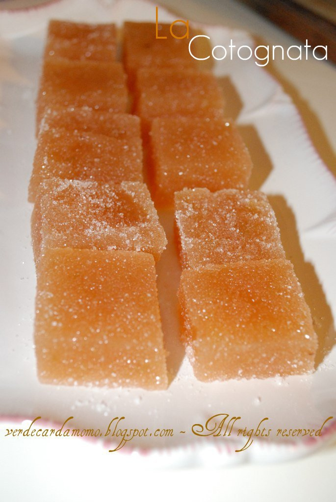 Scolate le mele cotogne con un setaccio (conservate il succo per realizzare una gelatina per esempio o continuate la cottura per la confettura) passate la polpa in un passaverdura a fori piccoli. Pesate la purea ottenuta aggiungete lo zucchero e trasferite il tutto sul fuoco. Portate a ebollizione a fuoco basso, mescolando con un cucchiaio di legno, poi proseguite la cottura a fuoco vivace finchè la purea si sarà addensata e tenderà a staccarsi dalle pareti della pentola.. Versate uno strato di 2 cm di spessore in uno stampo rettangolare (io ho usato quelli usa e getta di alluminio) precedentemente ricoperto da carta da forno unta d’olio. Lasciate raffreddare per 12 ore, poi girate la pasta ottenuta su un griglia. eliminate la carta da forno e lasciate essiccare per altre 12 ore. Versate lo zucchero in un piatto, tagliate a cubetti la pasta di cotogne e rotolateli nello zucchero. Conservate la cotognata dentro una scatola chiusa ermeticamente, posta in un luogo fresco e asciutto.
