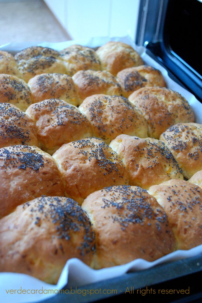 Versare l’impasto sulla spianatoia e sgonfiarlo leggermente senza lavorarlo troppo, ricavare dall’impasto 40 palline e rotolarle (solo la parte sopra) in un piattino con i semi di papavero e disporle in una teglia dai bordi alti (rivestita con carta forno) lasciando circa ½ cm di spazio tra l’una e l’altra perchè si gonfieranno e altrimenti si appiccicano. Coprire e lasciar lievitare ancora finchè le briochine non saranno raddoppiate e tutte unite (1 oretta circa).