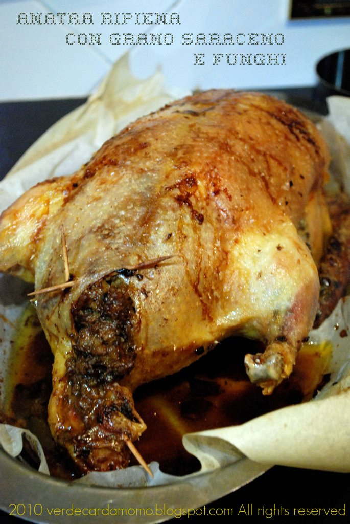 La ricetta più divertente è stata la preparazione di questa anatra ripiena con grano saraceno e funghi, pancetta e cipolla ..bisogna prima pulirla tutta bene dentro e qui abbiamo preso molto in giro Giulia, io e Ale, poi bisogna chiuderla per bene , metterle una specie di cintura di castità per non far uscire il ripieno ma come vedete dalle foto non siamo state molto brave a sigillarla forse era meglio usare ago e spago ma il risultato finale è stato buono lo stesso