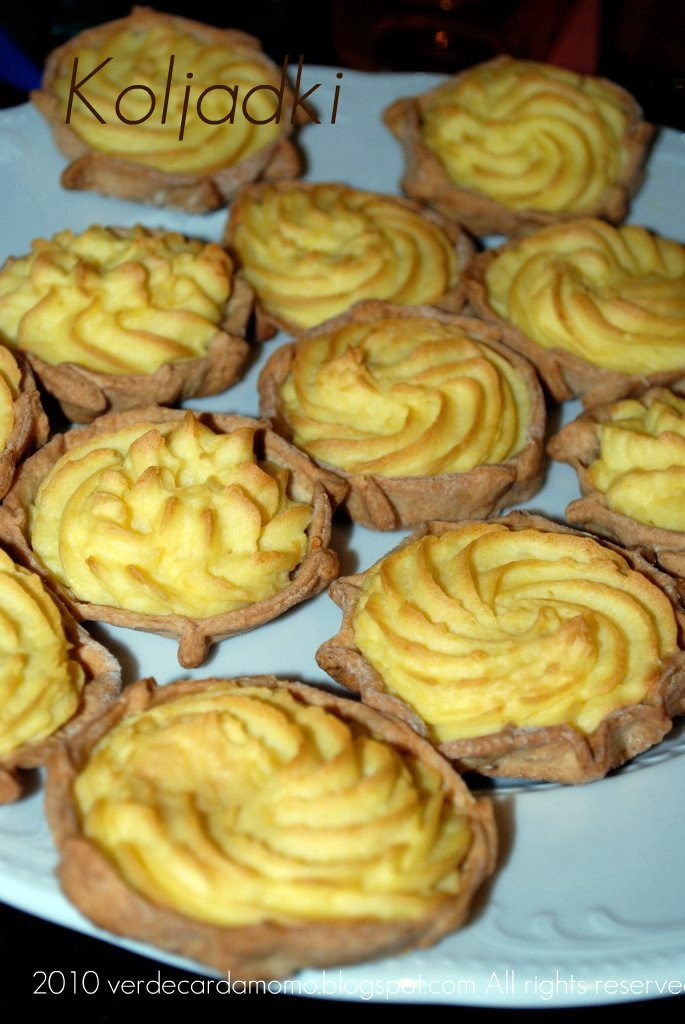 Siamo poi passate alla preparazione di questi koljadki ( non riuscirò mai a pronunciarli bene) veramente deliziosi e anche molto scenografici non trovate??. In pratica sono delle tartellette ripiene di purè di patate che si possono fare sia con ripieni salati per accompagnare zuppe o brodi sia con ripieni dolci per un tè o un caffè.