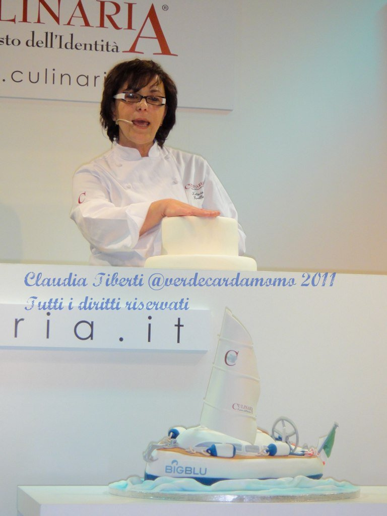 Letizia ha fatto una minilezione partendo da una torta già ricoperta di pasta di zucchero e ha creato una wedding cake con tema il mare!! Piccoli coralli, anemoni, conchiglie di pasta di zucchero per ricreare un ambiente marino e c’era pure la sabbia …che purtroppo dalla foto non si vede. Lei molto concentrata sul lavoro ha spiegato al pubblico con dettaglio come lavorare la pasta di zucchero..certo lei ha le mani d fata però..io non saprei dove metterle..le mani!!! E’ vero che queste torte decorate nascono in America e molte persone pensano che non si mangiano certo quelle americane non saprei se sono così buone ma queste di Letizia Grella hanno un cuore made in Italy e sono non solo dei capolavori d’arte culinaria ma anche dei capolavori di gusto!!!