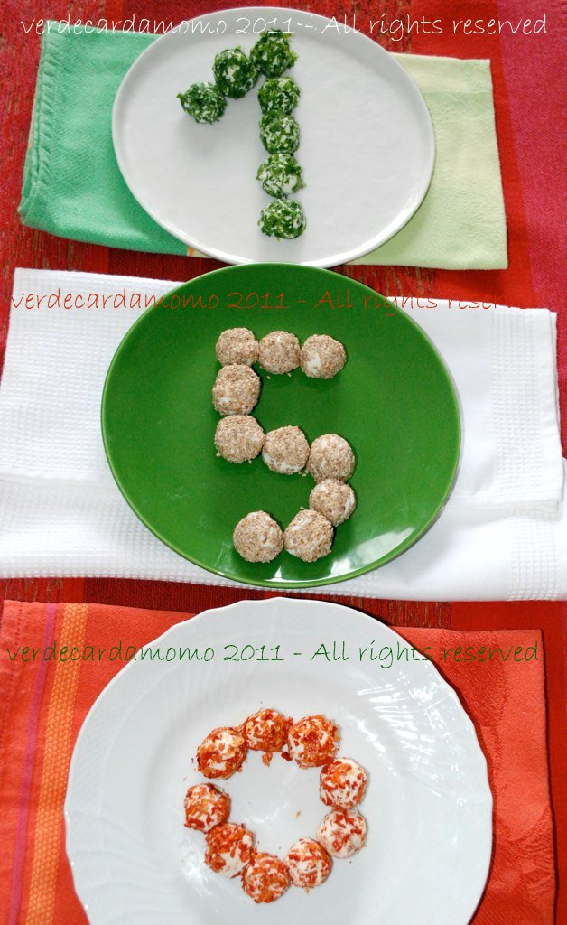 Amalgamate la ricotta con il parmigiano grattugiato e un pizzico di sale. Formate tante palline da rotolare in piattini differenti dove avrete messo un pò di paprika o peperoncino tritato, un pò di semi di sesamo e in un altro prezzemolo spezzettato .