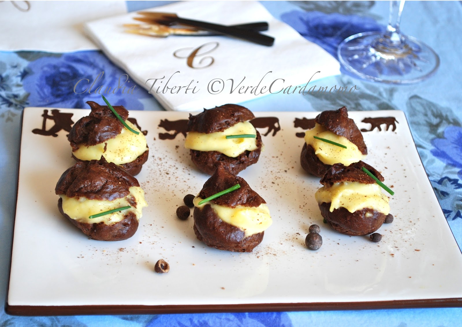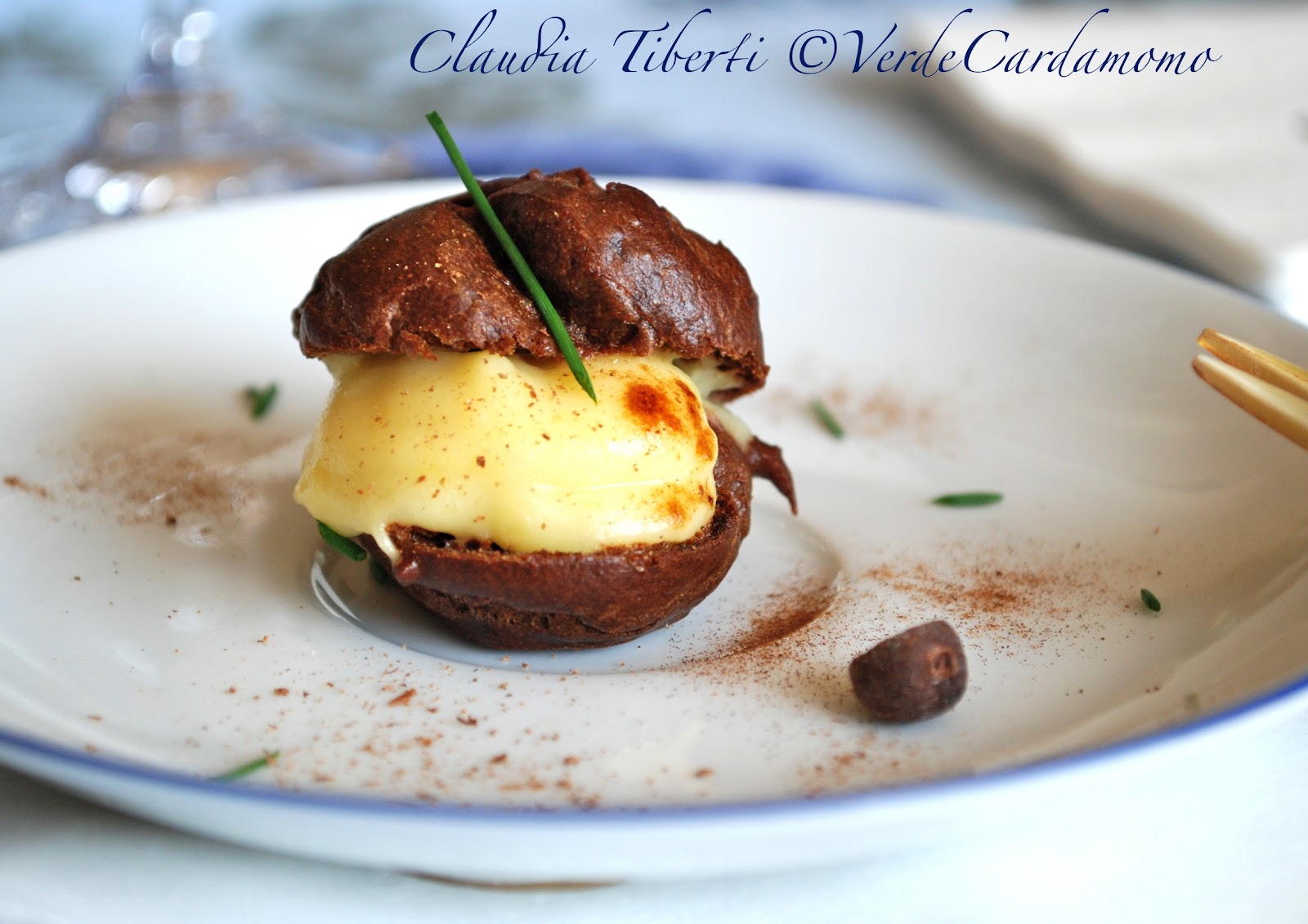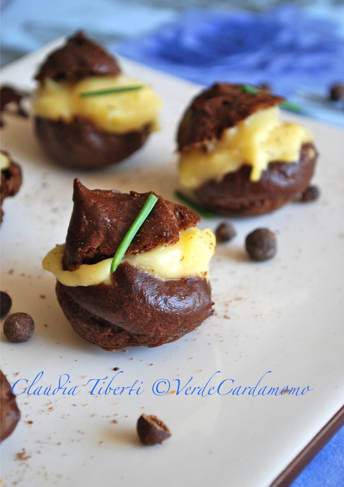 BIGNE’ ALLA LIQUIRIZIA CON CREMA DI PATATE AL PIMENTO ED ERBA CIPOLLINA