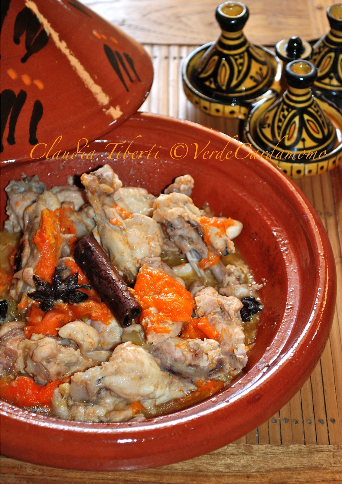 la tajine è tipica della cucina del Maghreb e deve il suo nome al recipiente di terracotta in cui viene cucinata e servita, composto da un piatto e da un coperchio conico forato che permette al vapore di uscire. In alternativa usate una casseruola di coccio.