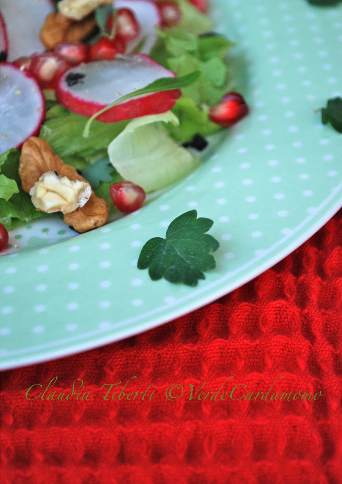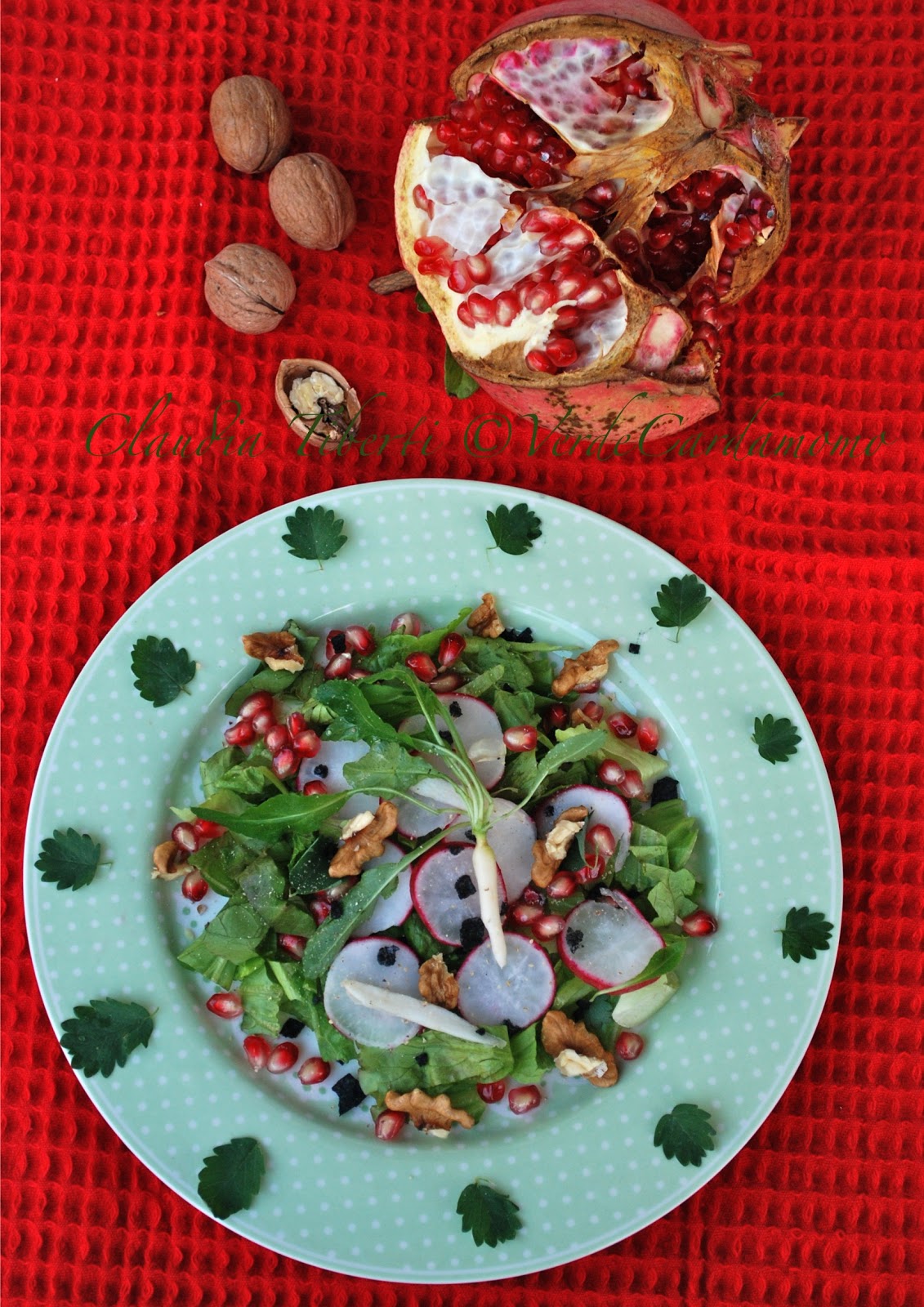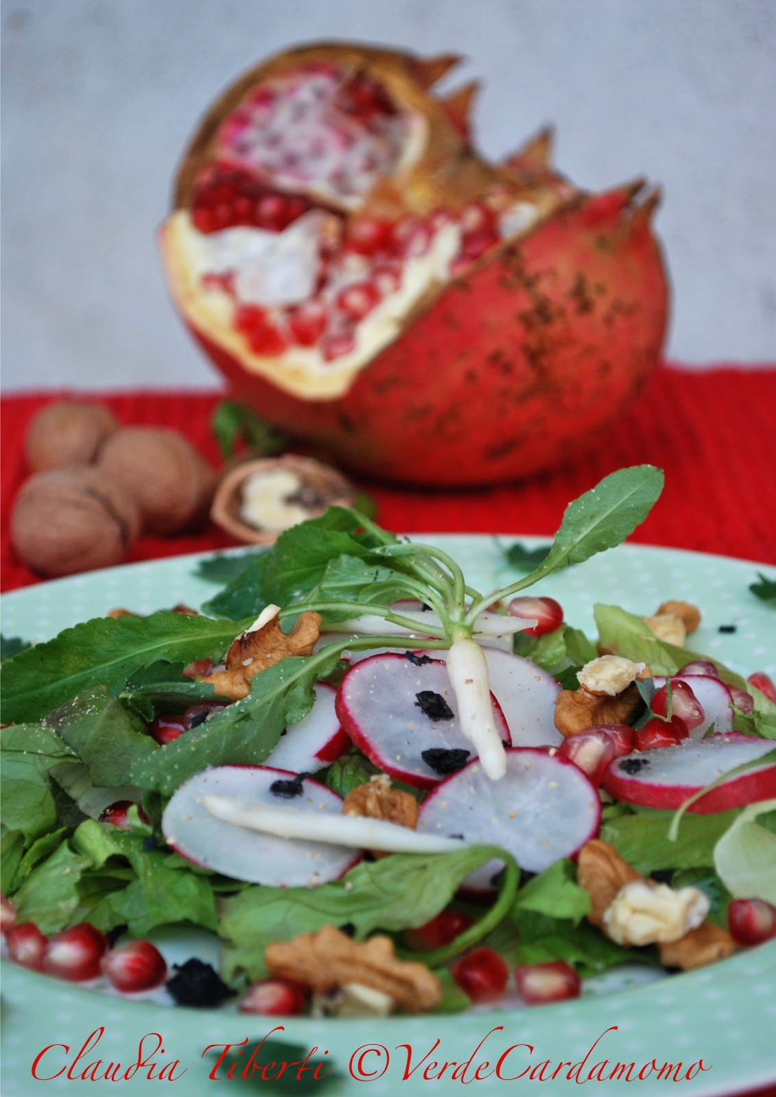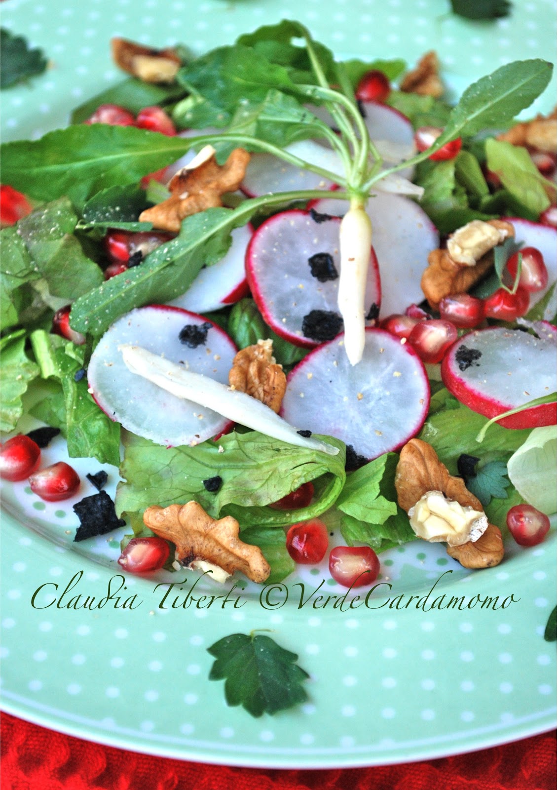 Per questa insalata non esiste una vera ricetta è un pò di tutto quello che ho comprato al mercato: noci, raperonzolo, ravanelli, lattuga, chicchi di melagrana un pò di fiocchi di sale nero di Cipro Falksalt per dare un contrasto di colore, una macinata di pepe bianco e olio evo.