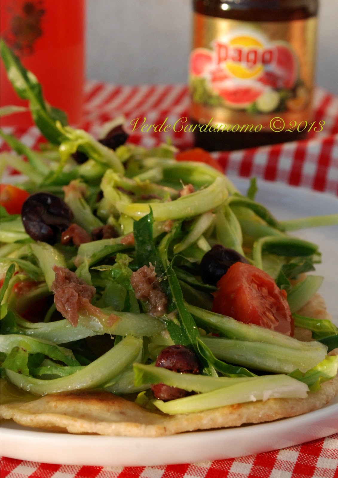 a questo punto ponete al centro del piatto la schiacciata e conditela con le puntarelle, qualche oliva taggiasca, qualche pomodorino un filo di olio evo e voilà.