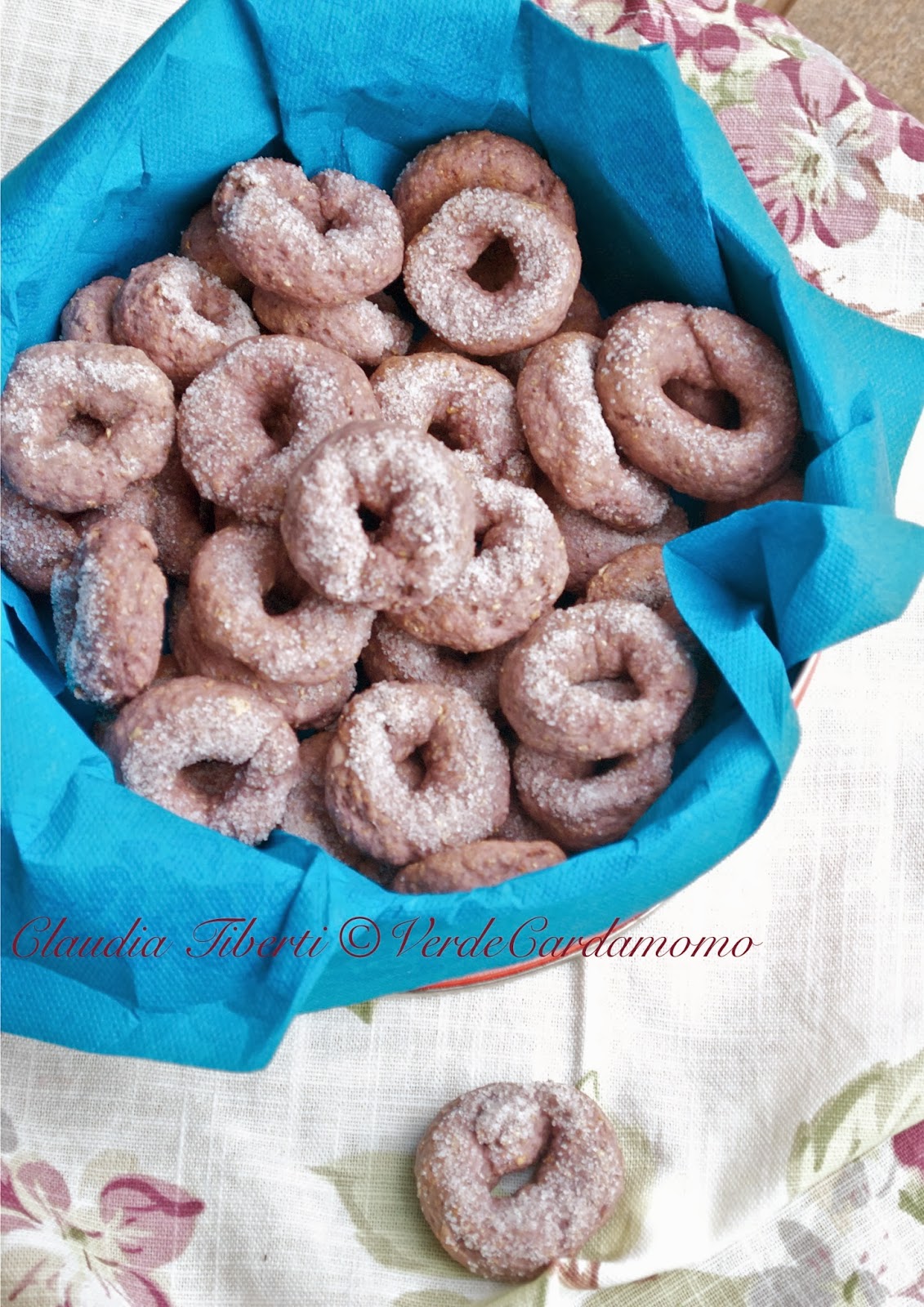Così ho sostituito il vino con del succo di mirtillo il che gli ha dato un bel colore rosso-violaceo, perfetto per le feste natalizie, e le ho rese abbastanza rustiche utilizzando per metà dose la farina integrale, infine le ho profumate aggiungendo dei semi di cardamomo.